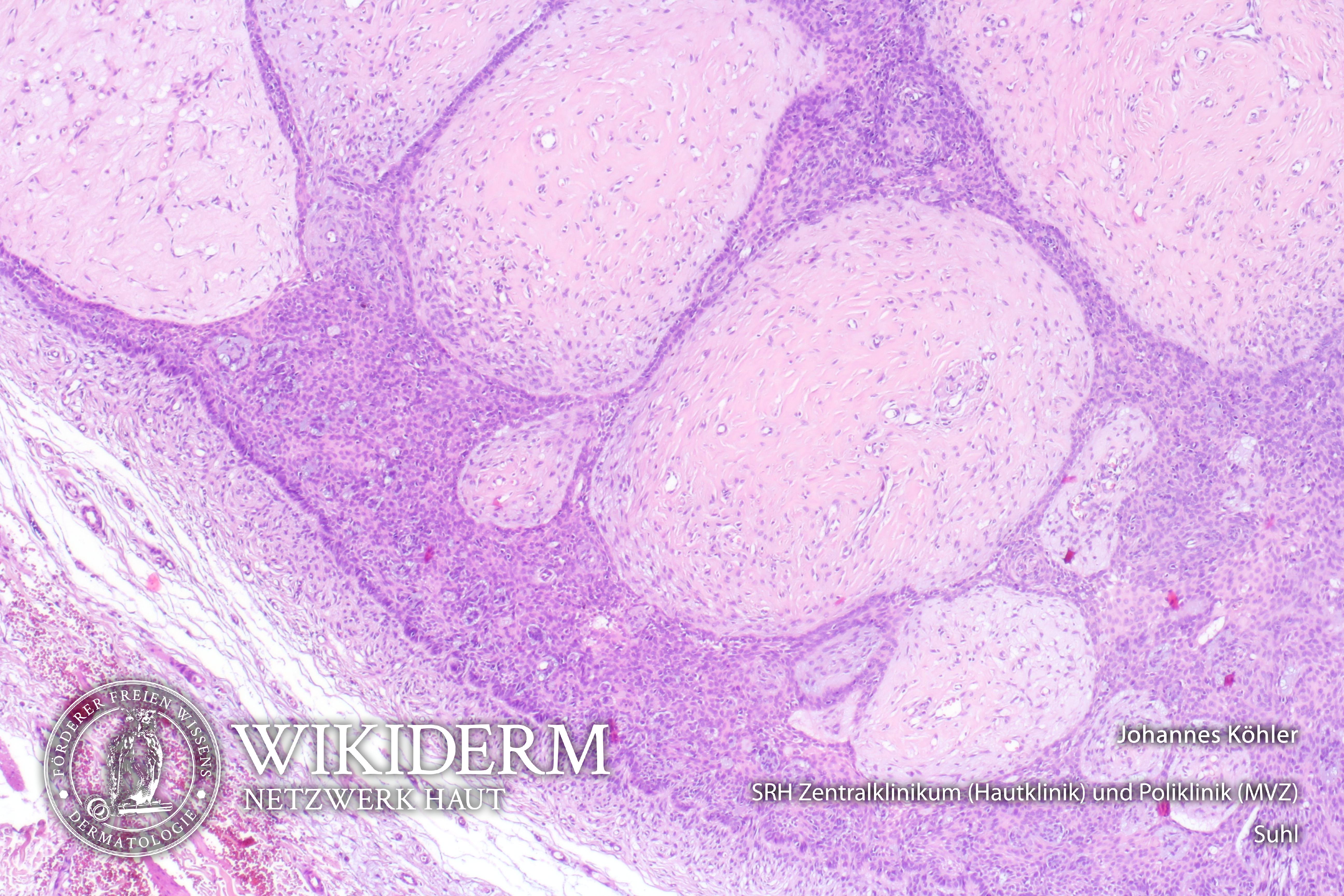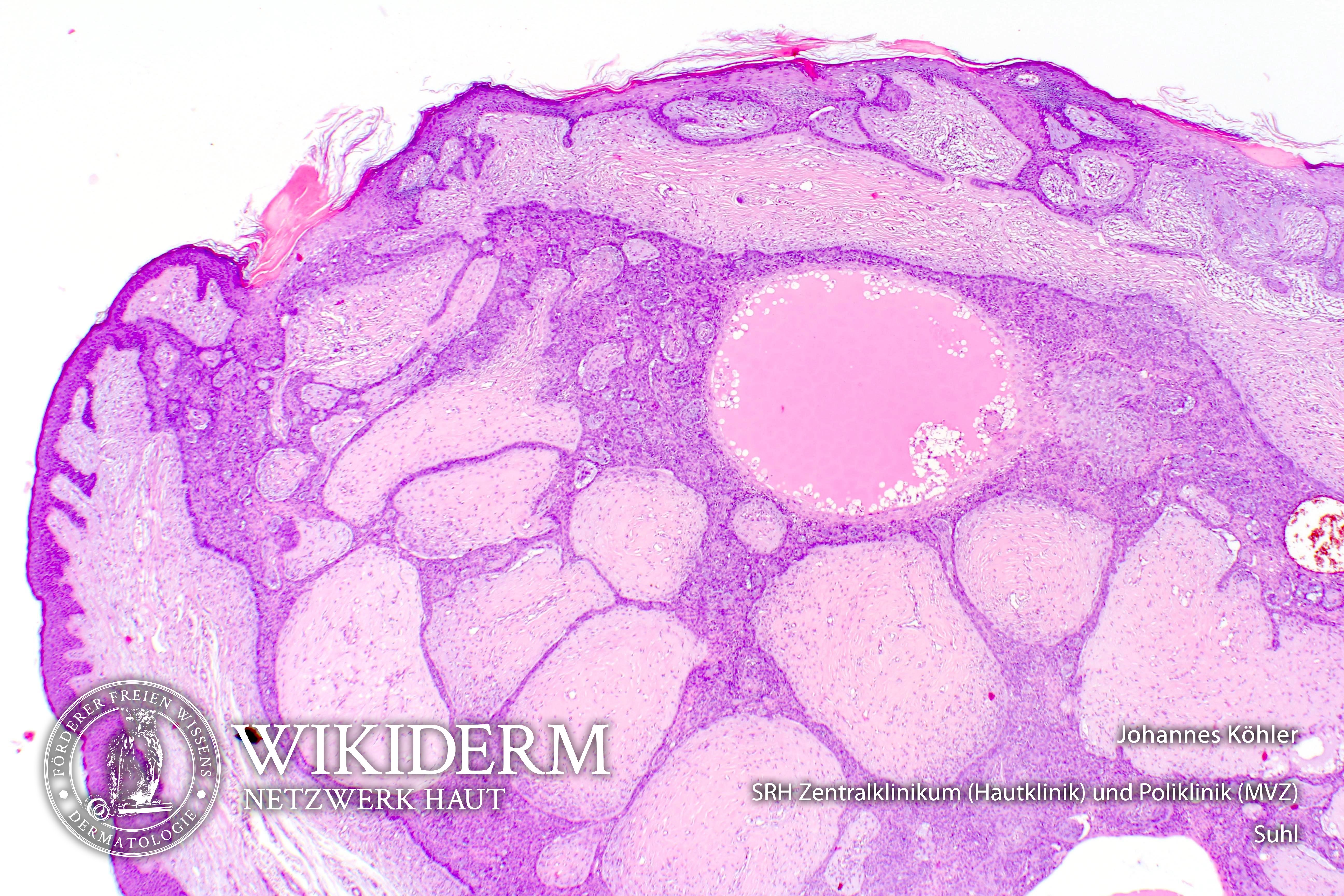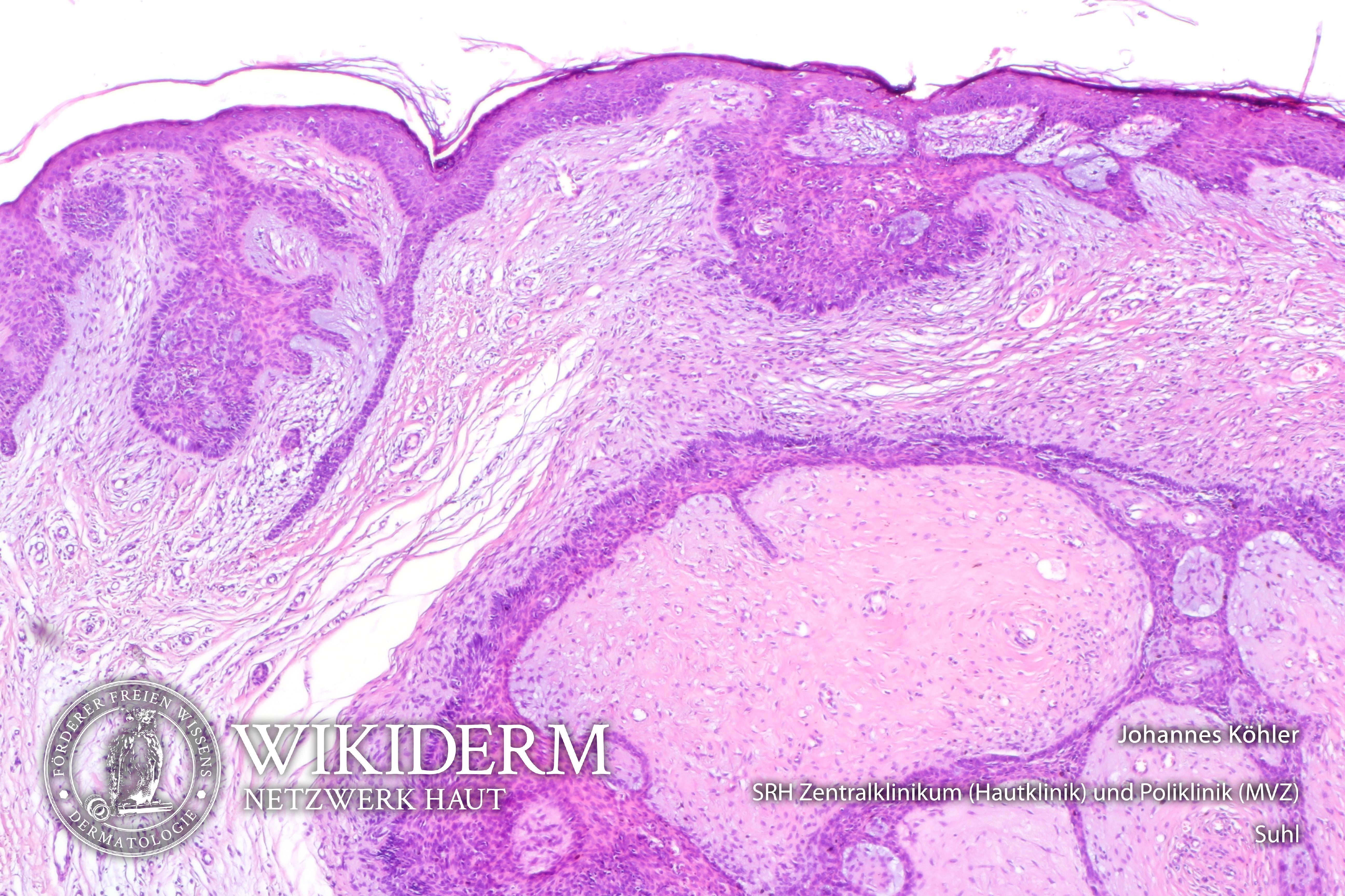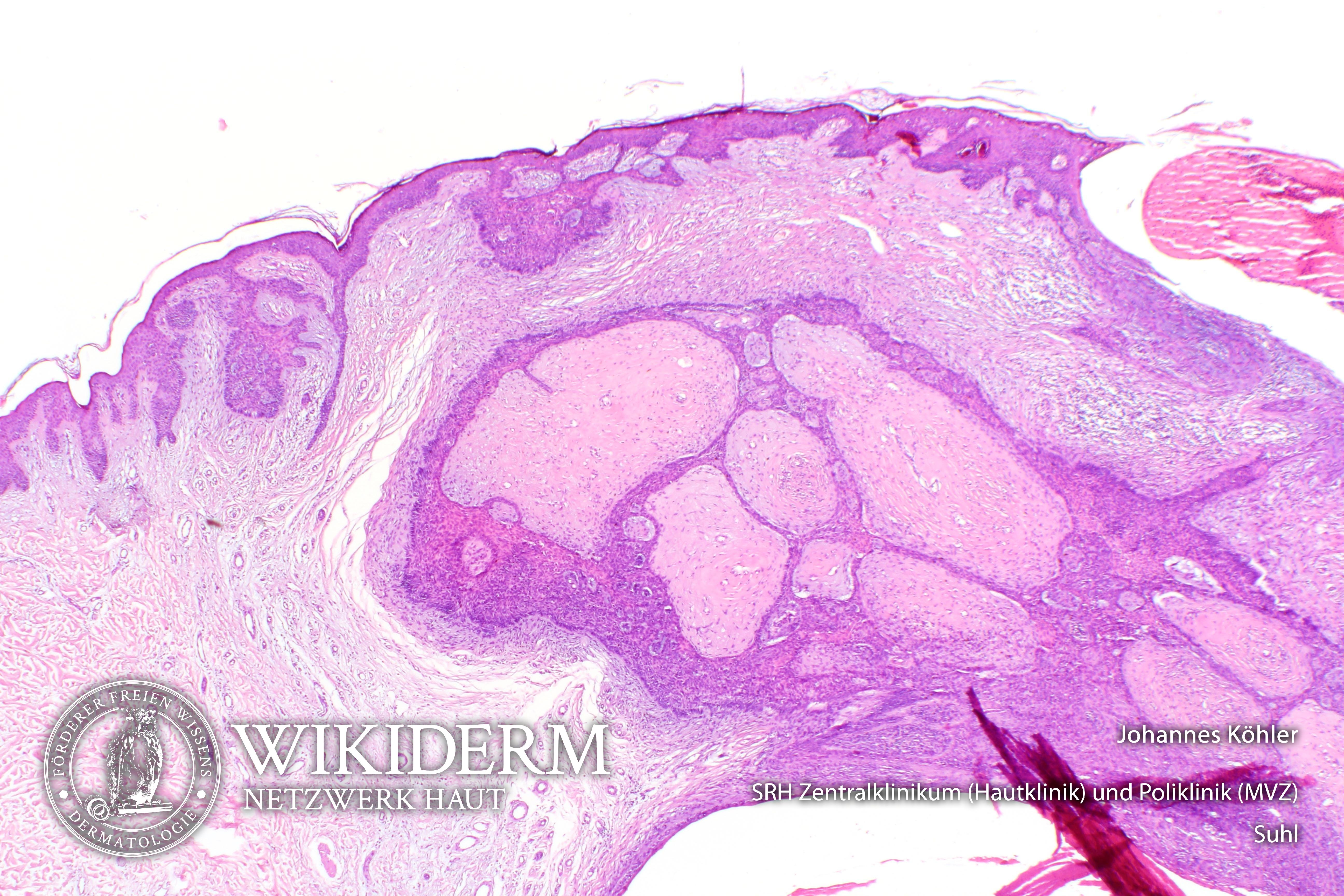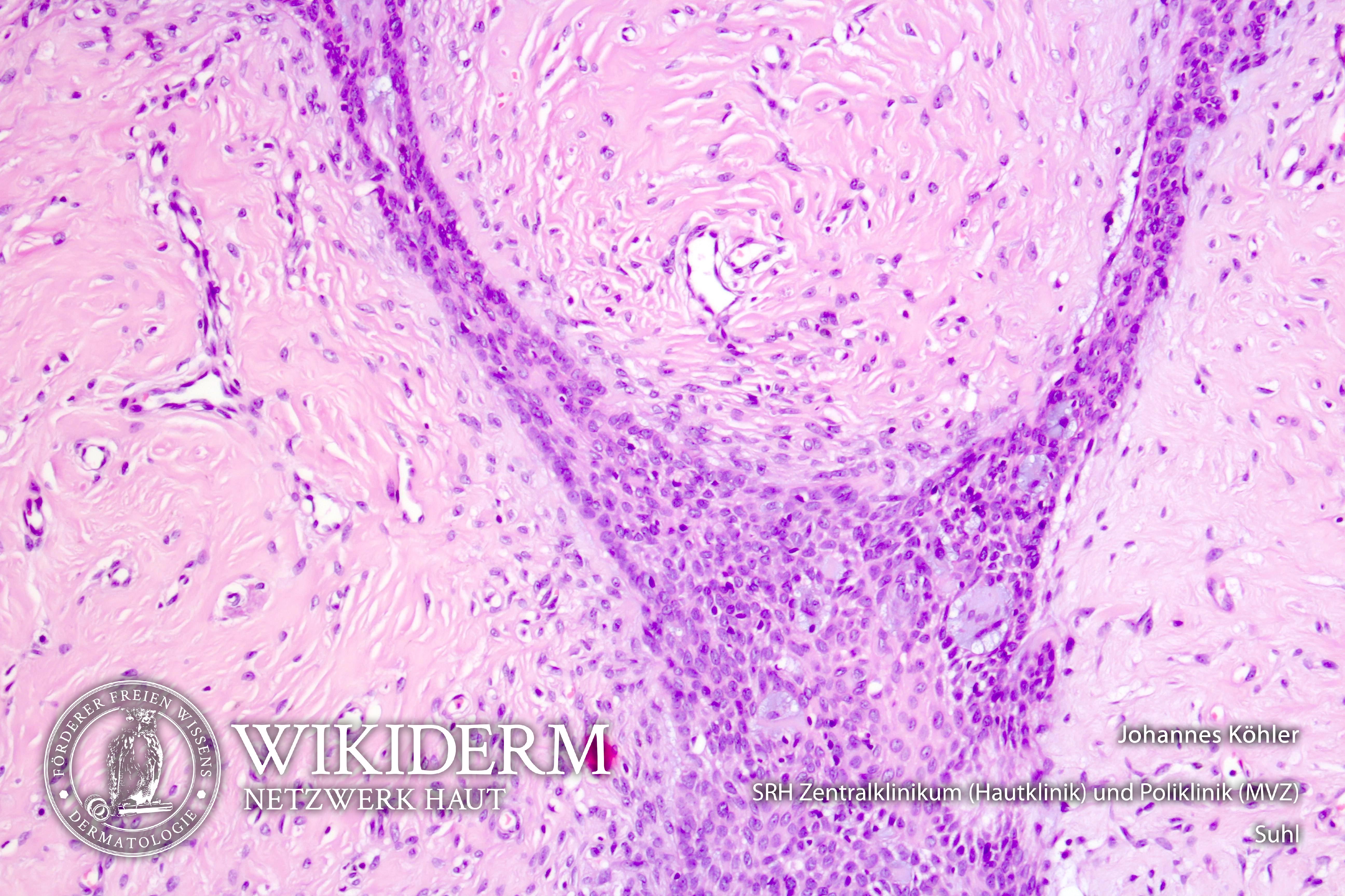 Hyp: Historischer Disput, ob der Pinkus-Tumor eher eine Variante des Basalzellkarzinoms oder eine Sonderform des Trichoblastoms darstellt. Neuere immunhistochemische und molekulargenetische Studien sprechen eher für letztgenannte Hypothese.